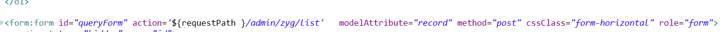 id: id ; action: 指向这个表单内数据提交的路径地址 ; modelAttribute : 会把表单的数据转换成mode 参数名为 record 必须和 controller 中mode的 参数名一致 css :样式 ;role :声明; method: 请求的方式;