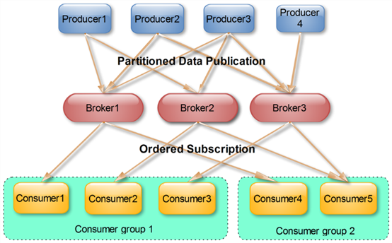 使用Consumer high level API时,同一Topic的一条消息只能被同一个Consumer Group内的一个Consumer消费,但多个Consumer Group可同时消费这一消息。