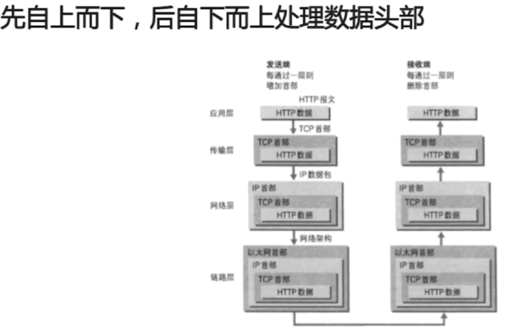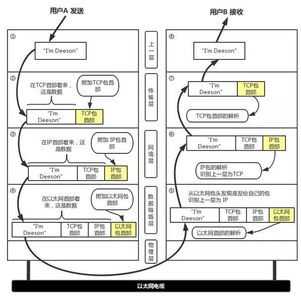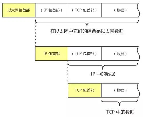 和OSI一样,在数据传输过程中,每个分层中,都会对所发送的数据附加一个首部,在这个首部中包含了该层必要的信息,如发送的目标地址以及协议相关信息。通常,为协议提供的信息为包首部,所要发送的内容为数据。在下一层的角度看,从上一层收到的包全部都被认为是本层的数据。