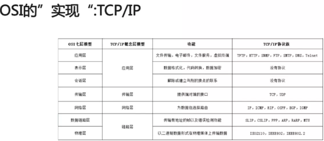 TCP/IP 与 OSI 在分层模块上稍有区别。OSI 参考模型注重“通信协议必要的功能是什么”,而 TCP/IP 则更强调“在计算机上实现协议应该开发哪种程序”。