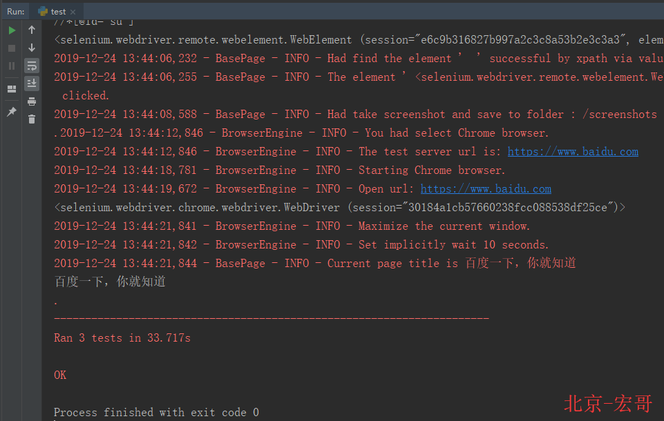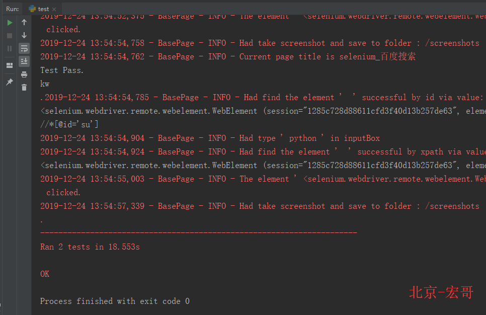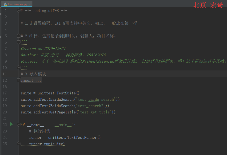 上面的testsuits是可以包名,也可以是一个文件夹名称,在实际脚本开发过程中,最后都采用这个方法来批量管理和执行几百上千的测试用例。下一篇内容,大概会介绍如何利用HTMLTestRunner.py这个开源的插件,生成测试报告,这个测试报告是一个HTML的格式。介绍完了生成报告文章,框架设计系列教程就会结束,不打算过多介绍其他技能点。