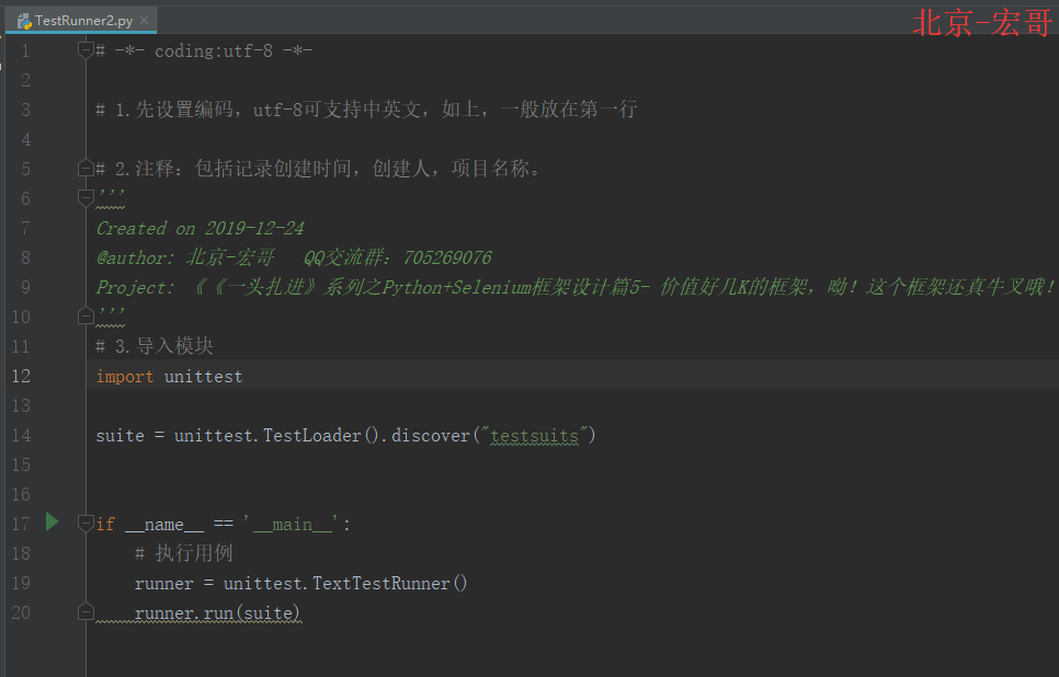 继续接着介绍,如何利用unittest管理和执行测试用例的问题,这里我们还是利用之前已经有的三条测试用例,如果你跳过了前面文章,请回到框架设计篇的第八篇和第七篇,里面有相关测试类的文件。本文来介绍,如果利用discover()方法去加载一个路径下所有的测试用例。这个方法是不是太适合我们现在的需求,例如我只需要跑testsuite包下所有测试用例,不管在里面有多少个包和多少个测试类,只需要用discover()搞定,来看看这个场景下TestRunner.py如何写。