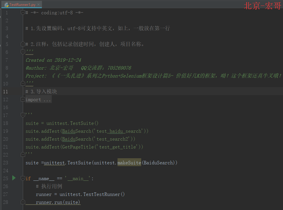 前面文章介绍了如何用addTest()方法来加载我们测试用例到suite中去,本文介绍利用makeSuite()方法,一次性加载一个类文件下所有测试用例到suite中去。还是利用前面一篇文章中的测试脚本,来看看TestRunner.py如何写。