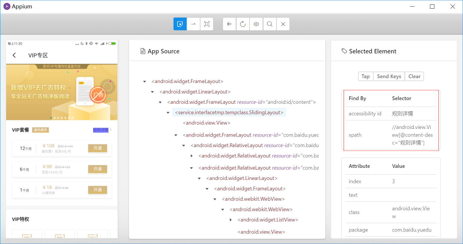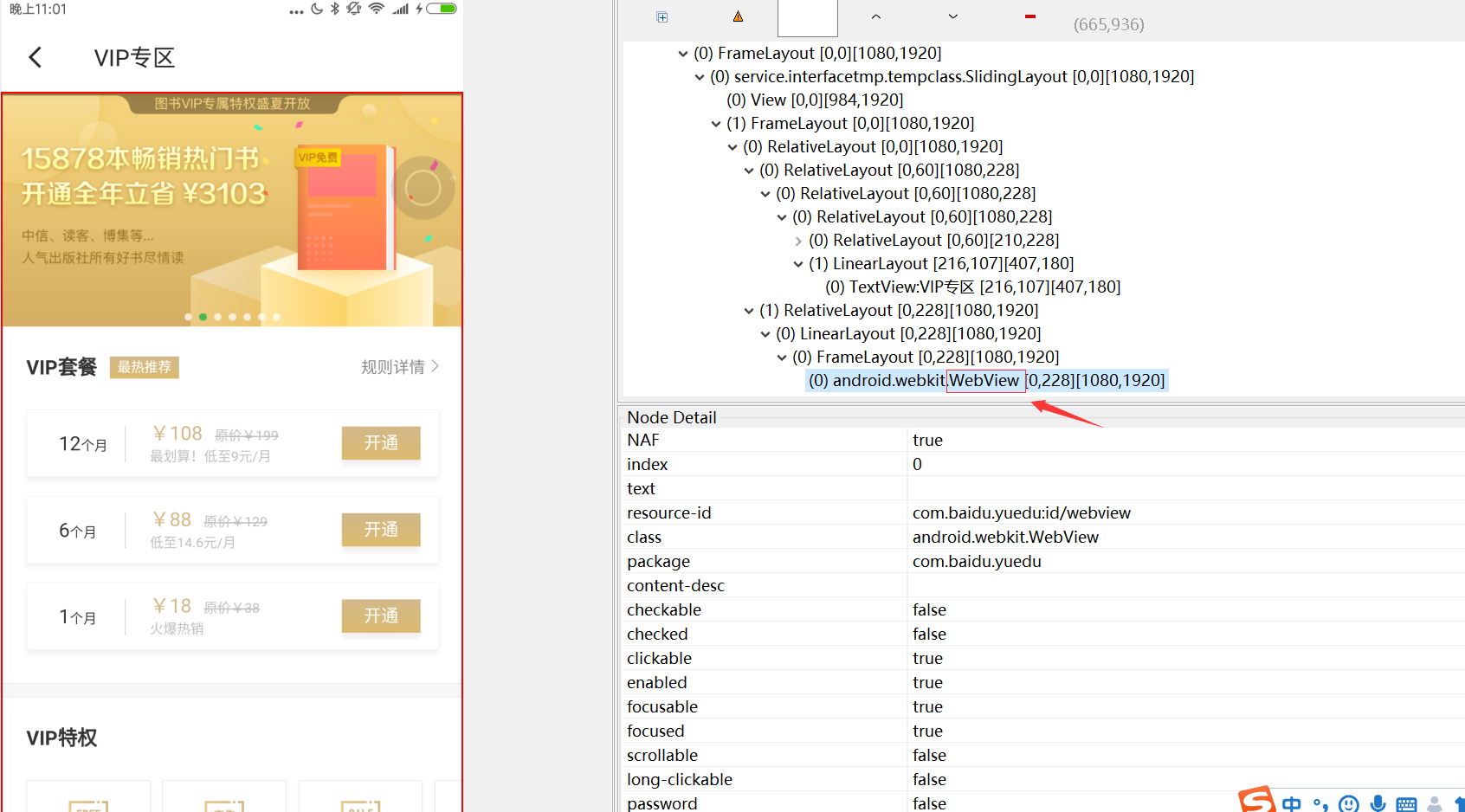 当你打开百度阅读APP→VIP全站去广告→用自带的 UI Automator去定位里面的元素,如图: