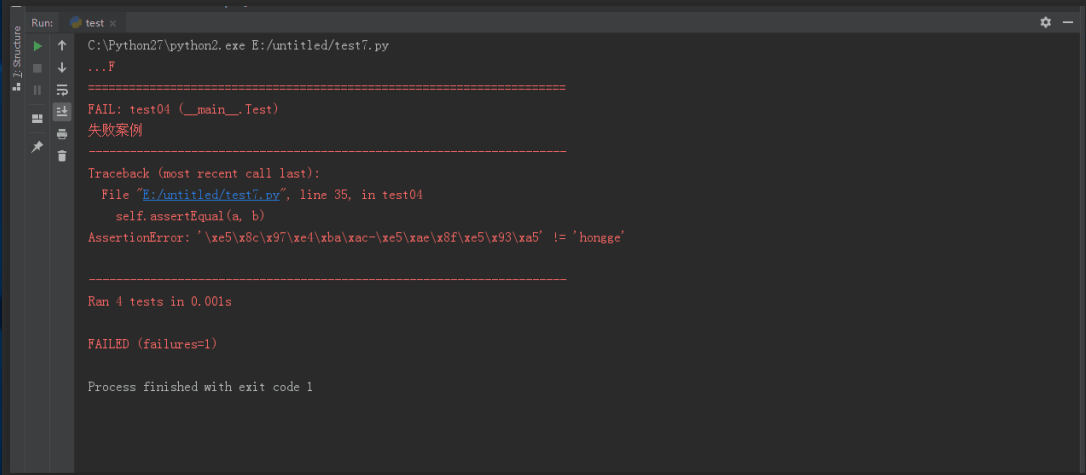 3、在python2中执行的结果,中文编码不对,没正常显示中文,遇到这种情况,可以自定义异常输出,python3正常。有时候也可以根据实际需要采用自定义异常输出,要灵活掌握。