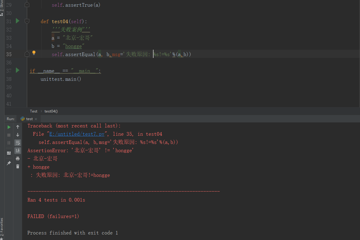 3、这里除了相比较的两个参数 first 和 second,还有第三个参数 msg=None,这个 msg 参数就是遇到异常后自定义输出信息