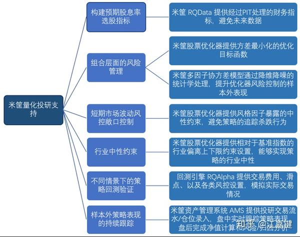 从量化多因子角度来看,股票组合的市场风险包括大盘涨跌风险、风格暴露风险、行业暴露风险、以及个股特殊风险四类。通过选择合适的风险进行暴露,能够有效增加策略的收益,但同时也会增加策略表现的波动。预期股息率策略的出发点在于以合理估值长期持有优秀企业,获取其分红和业绩增长带来的长期溢价,且仓位选择上不受市场短期波动的干扰,以避免追涨杀跌的行为。相对于在牛市阶段获取高收益,策略更关注在熊市阶段控制业绩回撤,通过防御型的风险管理,使得复利效应能够持续发挥作用。因此,策略的主动风险暴露在基本面因子[4]上,而对大盘涨跌风险、量价因子暴露风险、行业暴露风险、个股特殊风险均进行了限制。具体说明可见图2.1.1总结。米筐科技的量化投研产品为预期股息率策略的实现提供了完整的支持,总结可参看图2.1.2。
