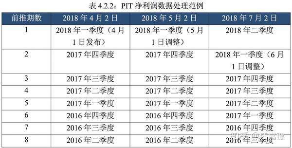 则在2018年4月2日、2018年5月2日和2018年7月2日计算该公司最近八期的PIT单季度净利润数据时,所使用的实际报告期如表4.2.2所示。