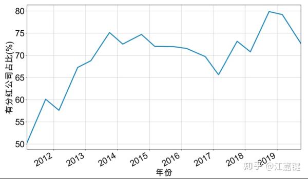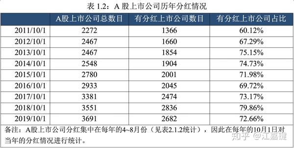 另一方面,自从2008年证监会发布《关于修改上市公司现金分红若干规定的决定》起,监管机构发布多个规范性文件,对A股上市公司分红进行持续的鼓励和引导,通过现金分红回馈投资者的上市公司逐年增加。图1.1和表1.2展示了从2011年以来A股上市公司的分红情况,可以看出自2014年开始,有现金分红的上市公司占比大部分时期均稳定在70%以上,这为在A股市场实践红利选股策略提供了丰富的可选标的。