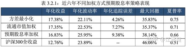 - 不同加权方式下,近六年间股息率策略的收益和夏普率均高于沪深300,而最大回撤均小于沪深300。说明在不同的加权方式下,预期股息率因子通过较好的选股能力保证了策略的表现;