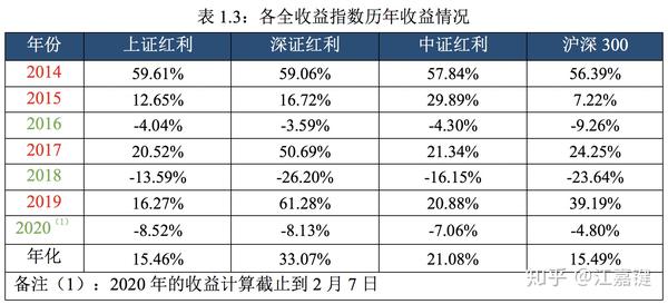 表1.3展示了2014~2019年间红利全收益指数和沪深300全收益的历年表现对比。其中上证红利和中证红利展示出防御型指数的特征——在熊市年份(2016和2018年)回撤小于沪深300,但除2015年外,在牛市年份表现整体不如沪深300;深证红利则表现出进攻型指数的特征——在牛市年份(2014、2015、2017和2019年)表现较为出色,但在熊市阶段曾出现较大的回撤(2018年和2020年年初)。