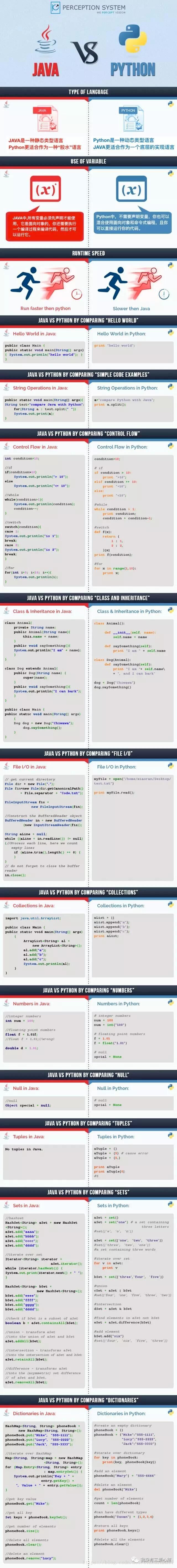 引入一张比较著名的图吧,可以很明显地感受到 Python 在写法上要简洁一些吧: