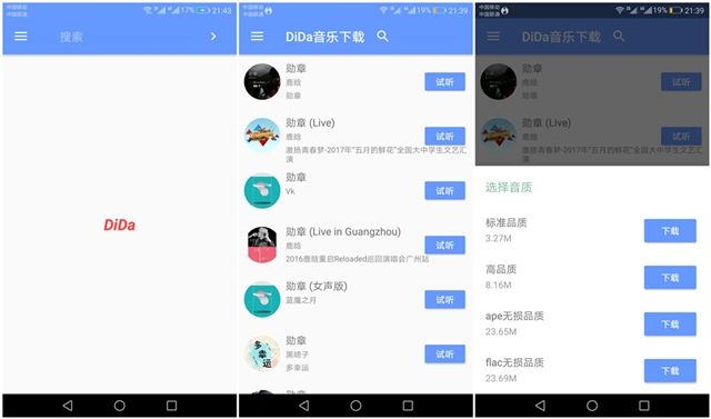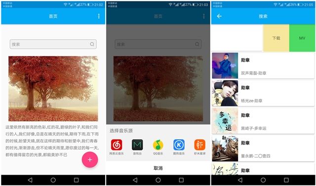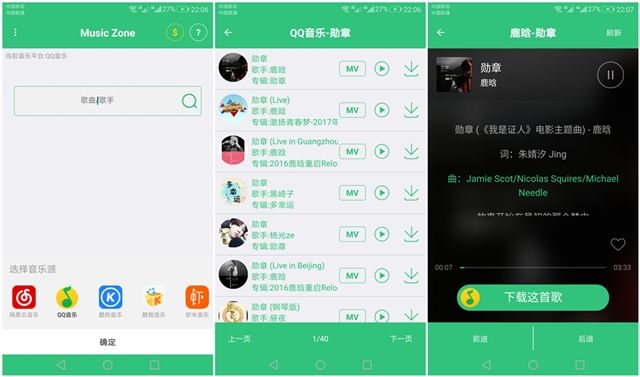 支持网易云音乐、音悦台、QQ音乐、酷狗音乐、虾米星球,搜索后左滑可以下载高品质歌曲跟MV,还可以在线听。
