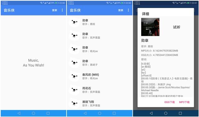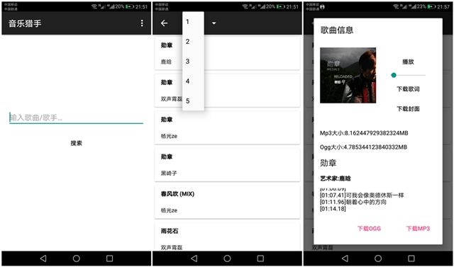 音乐搜索,下载,一些付费的也可免费下载。目前功能上比较简单,作者还在优化跟进中。支持查看歌词信息,可下载歌词。支持下载OGG以及下载MP3格式音乐。下载完成后,可扫描到本地播放器。