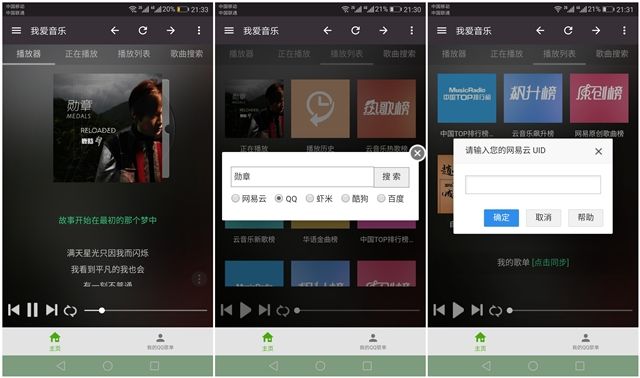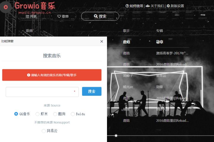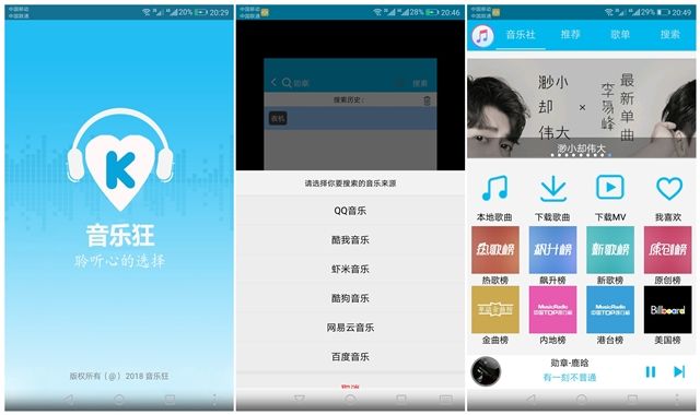 支持的音乐来源网站比较多,QQ,网易,酷狗,酷我,虾米,百度,一听,咪咕,荔枝,蜻蜓,喜马拉雅,全民K歌,5sing原创,5sing翻唱,SoundCloud,可以在线听,或者下载。