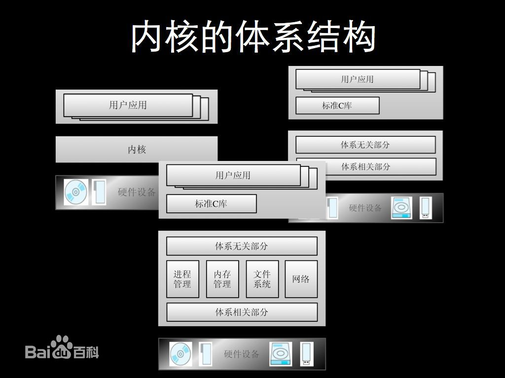 现代操作系统设计中,为减少系统本身的开销,往往将一些与硬件紧密相关的(如中断处理程序、设备驱动程序等)、基本的、公共的、运行频率较高的模块(如时钟管理、进程调度等)以及关键性数据结构独立开来,使之常驻内存,并对他们进行保护。通常把这一部分称之为操作系统的内核。
