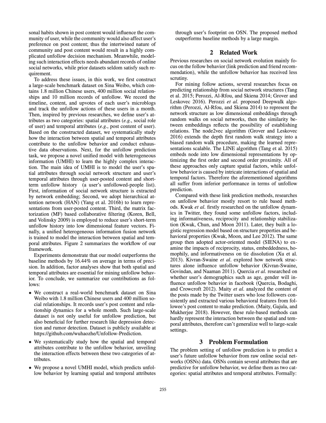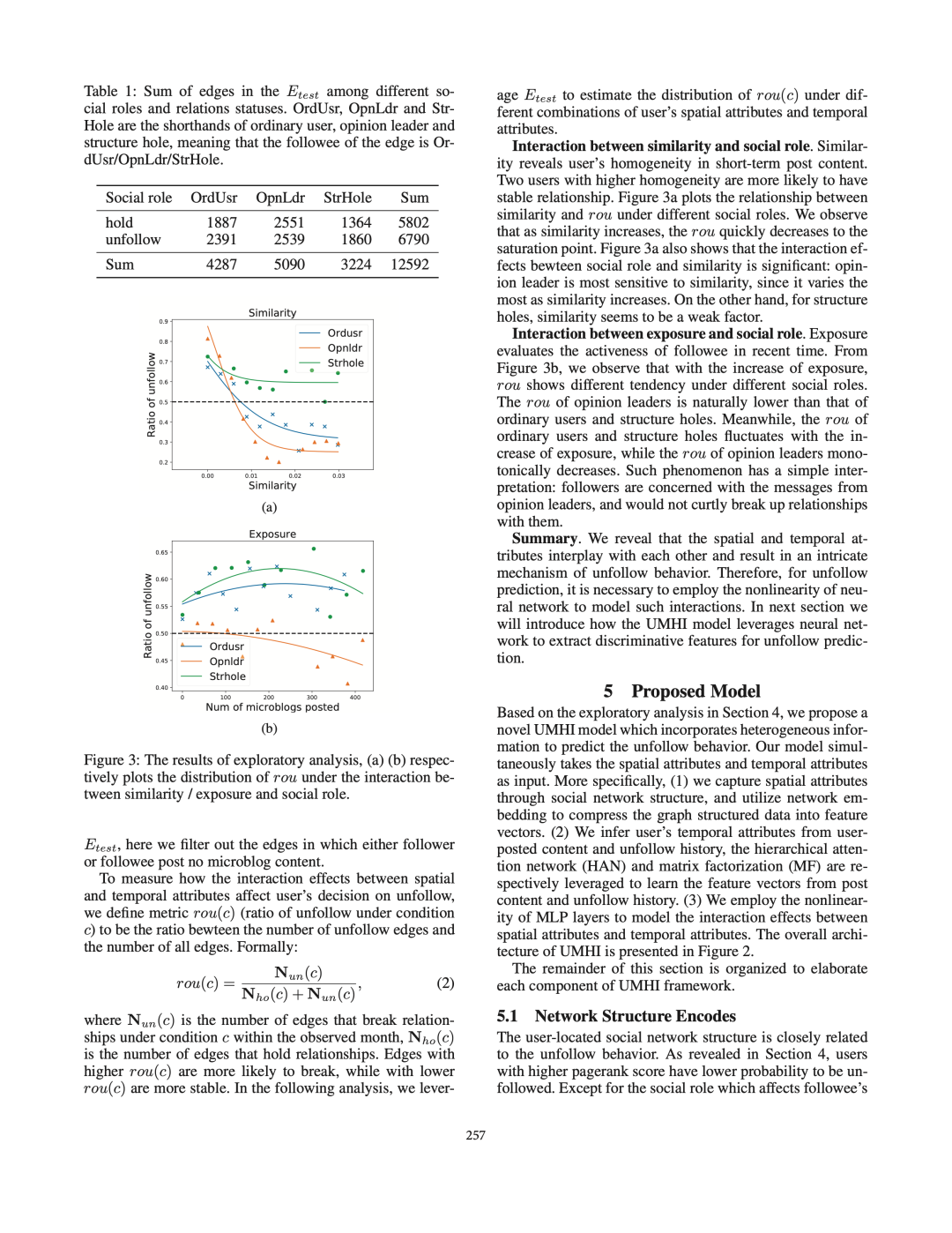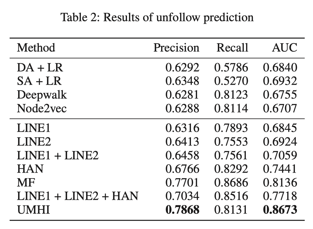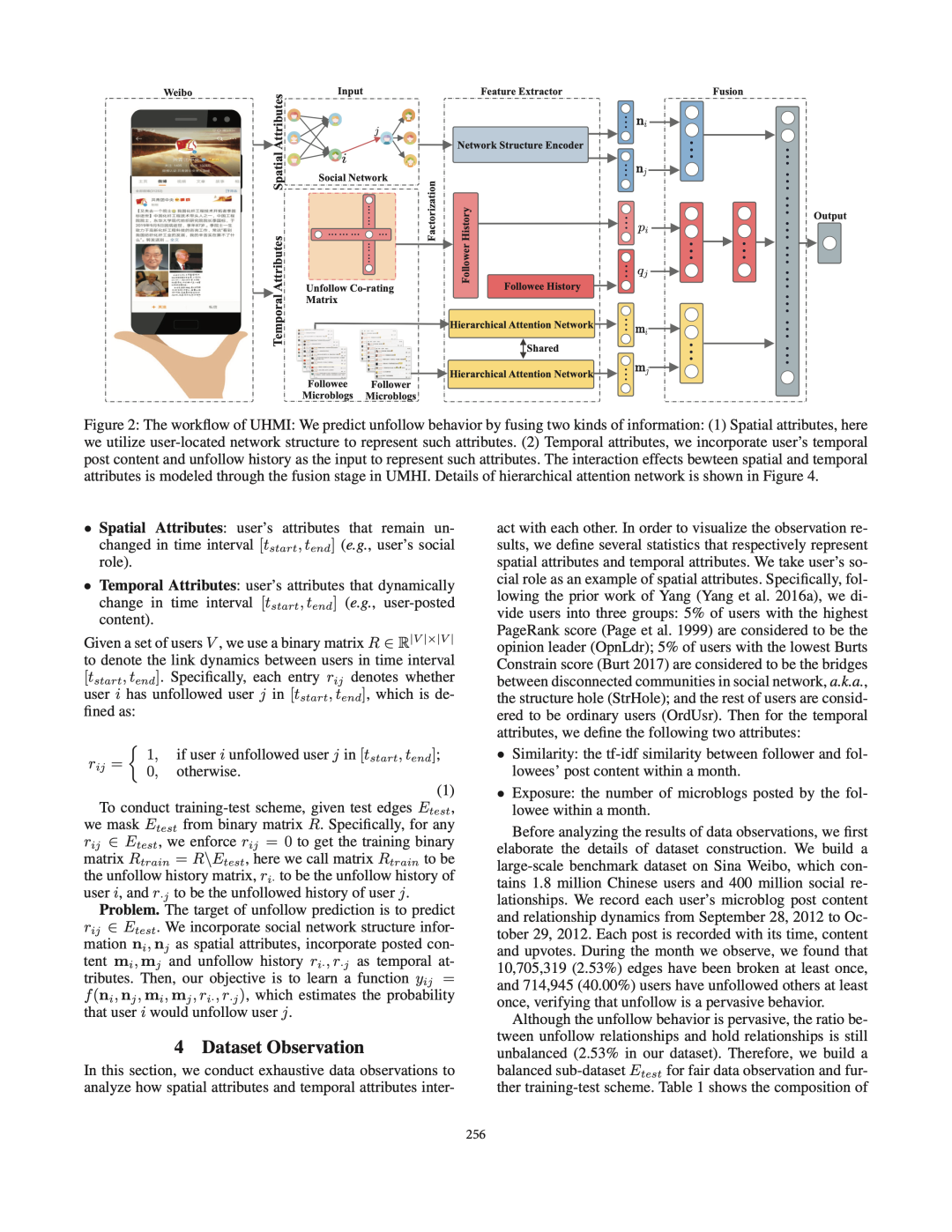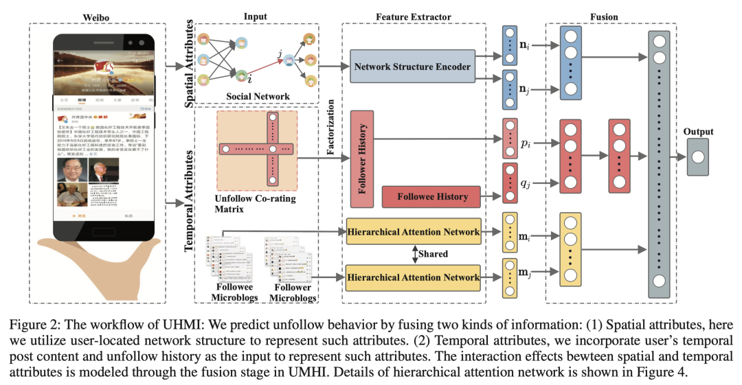 接下来,我们将用户的属性定义为两类:空间属性(例如,用户的社会角色)和时间属性(例如,用户的帖子内容)。利用构建的数据集,我们系统地研究了用户的空间和时间属性之间的交互作用如何导致取消关注行为。之后,我们提出了UMHI,具有异构信息的统一模型,用于取消关注行为预测。