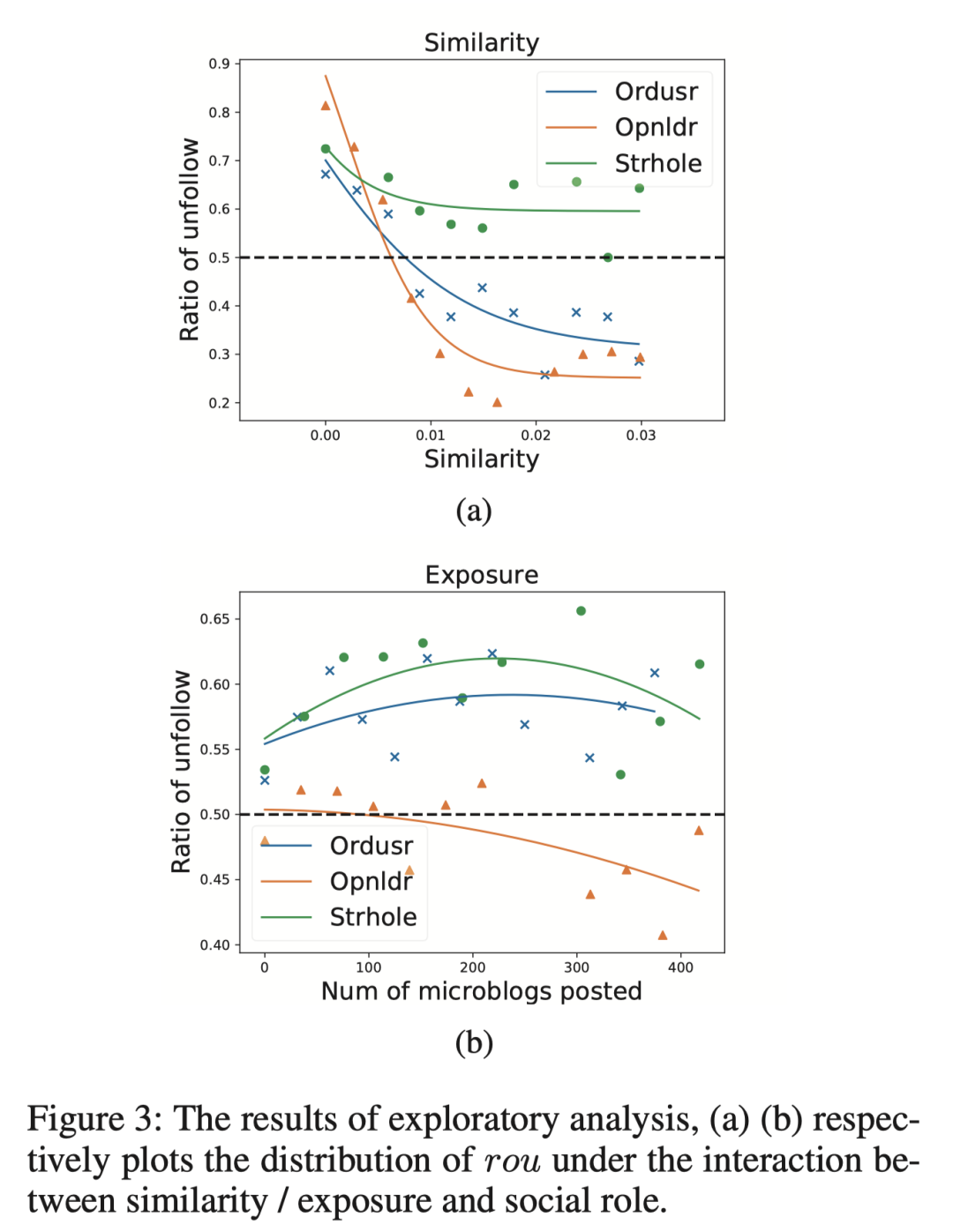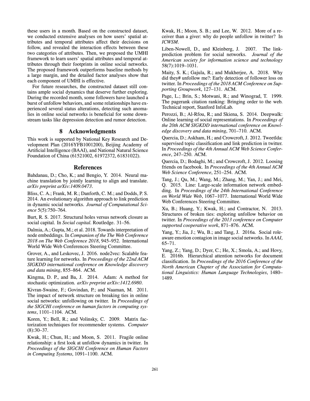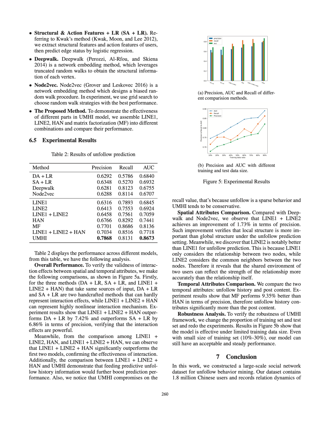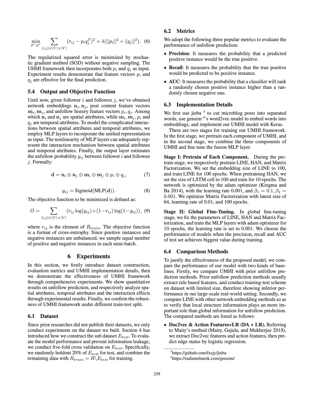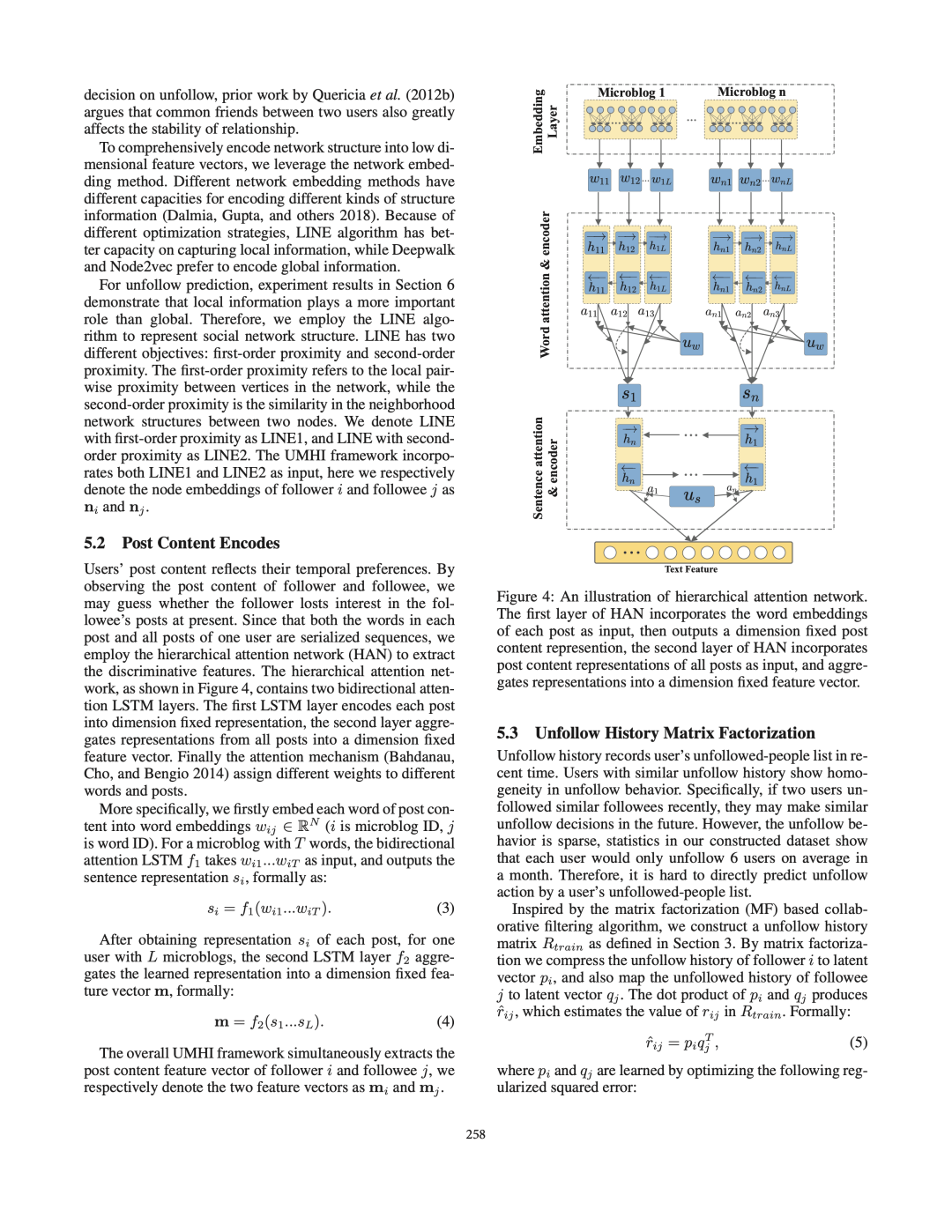 接下来,我们将用户的属性定义为两类:空间属性(例如,用户的社会角色)和时间属性(例如,用户的帖子内容)。利用构建的数据集,我们系统地研究了用户的空间和时间属性之间的交互作用如何导致取消关注行为。之后,我们提出了UMHI,具有异构信息的统一模型,用于取消关注行为预测。