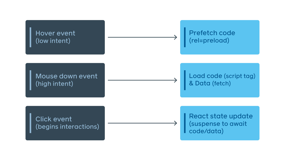 客户端应用程序通常要等到React渲染一个页面后才会下载该页面所需的代码和数据。通常情况下使用React.lazy或类似的东西实现。由于这可能会使页面导航速度变慢,所以我们反而会在链接被点击之前就开始请求一些必要的资源。