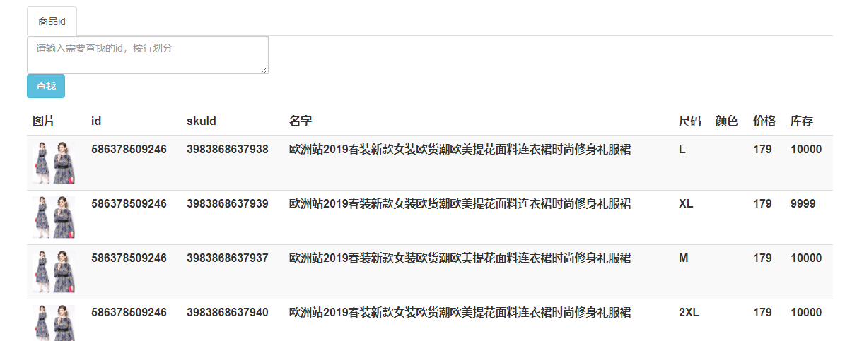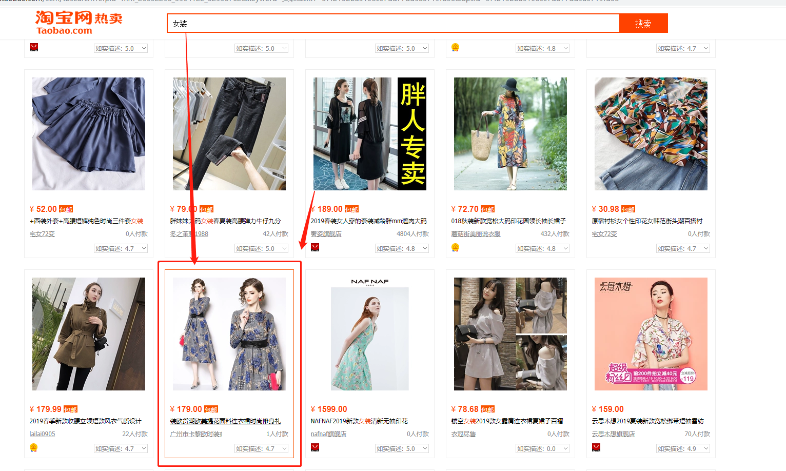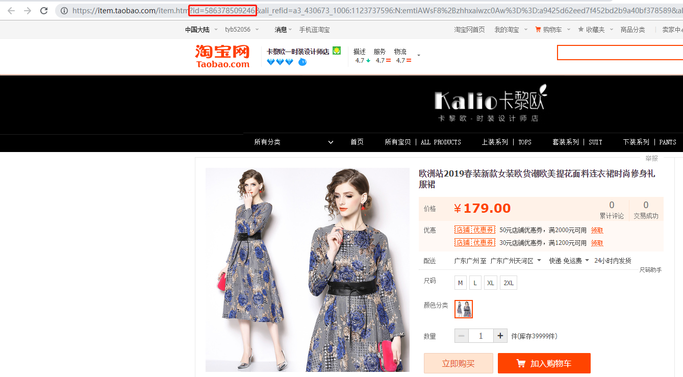 id 的来源为搜索淘宝的商品关键词后,点击进入详情页,可以在 url 中看到所需要的商品的 id 。例如搜索关键词 女装,点击其中一个进入页面: