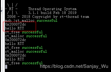 (2)观察FinSH,开机按下3次KEY0,如下现象,会打印出申请到内存的地址,2秒后释放内存: