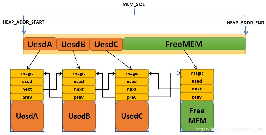 (2)当需要分配内存块时,将从这个大的内存块上分割出相匹配的内存块,然后把分割出来的空闲内存块还回给堆管理系统中。每个内存块都包含一个管理用的数据头,通过这个头把使用块与空闲块用双向链表的方式链接起来(内存块链表)。