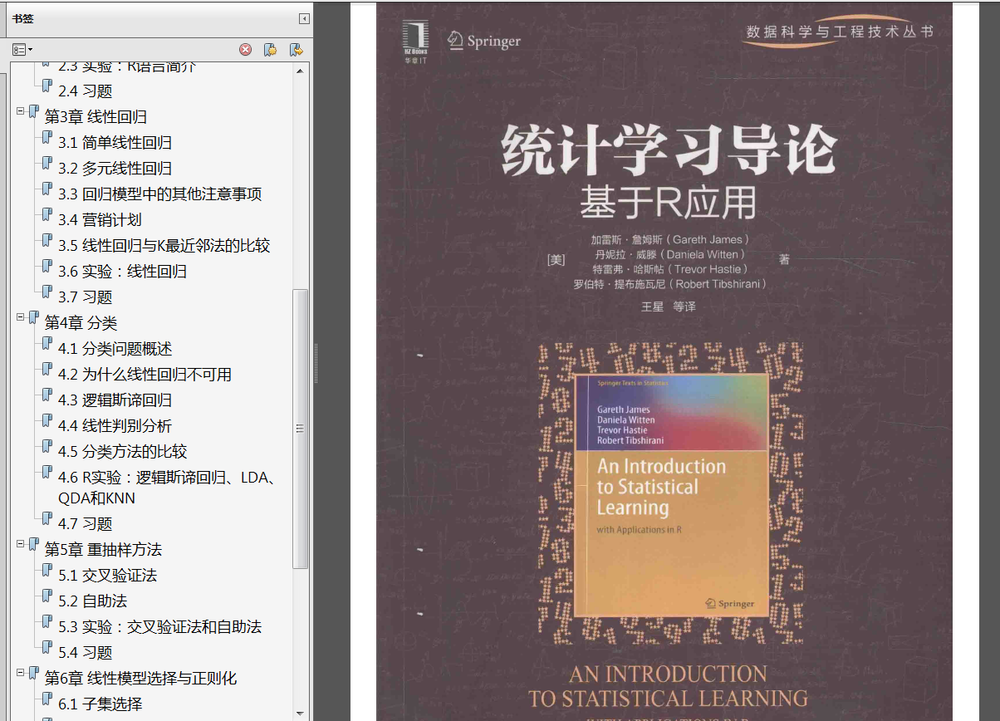 《统计学习导论:基于R应用》高清中文PDF,323页,带书签目录,彩色配图,文字可以复制;高清英文PDF,436页,带书签目录,彩色配图,文字可以复制;配套源代码。