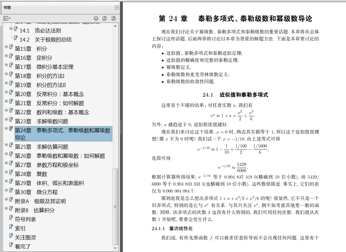 共30个篇章,外加两个附录,主要是对一些重要的定理进行证明。30个篇章从最基本的函数图像、极限、导数等进行讲起,再到后来微分方程和积分的方法。从每篇文章的编排和作者的表述可以看出作者数学功底的深厚,深入浅出的介绍了各种求导方法和证明极限的过程。