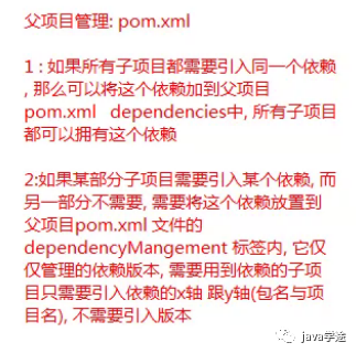 如果某部分子项目需要引入某个依赖,而另一部分不需要,需要将这个依赖防止到父项目的pom.xml文件中的dependencyMangement标签内,它仅仅管理的依赖版本,需要用到的依赖在子项目中只需引入X轴跟Y轴,不需要引入版本;