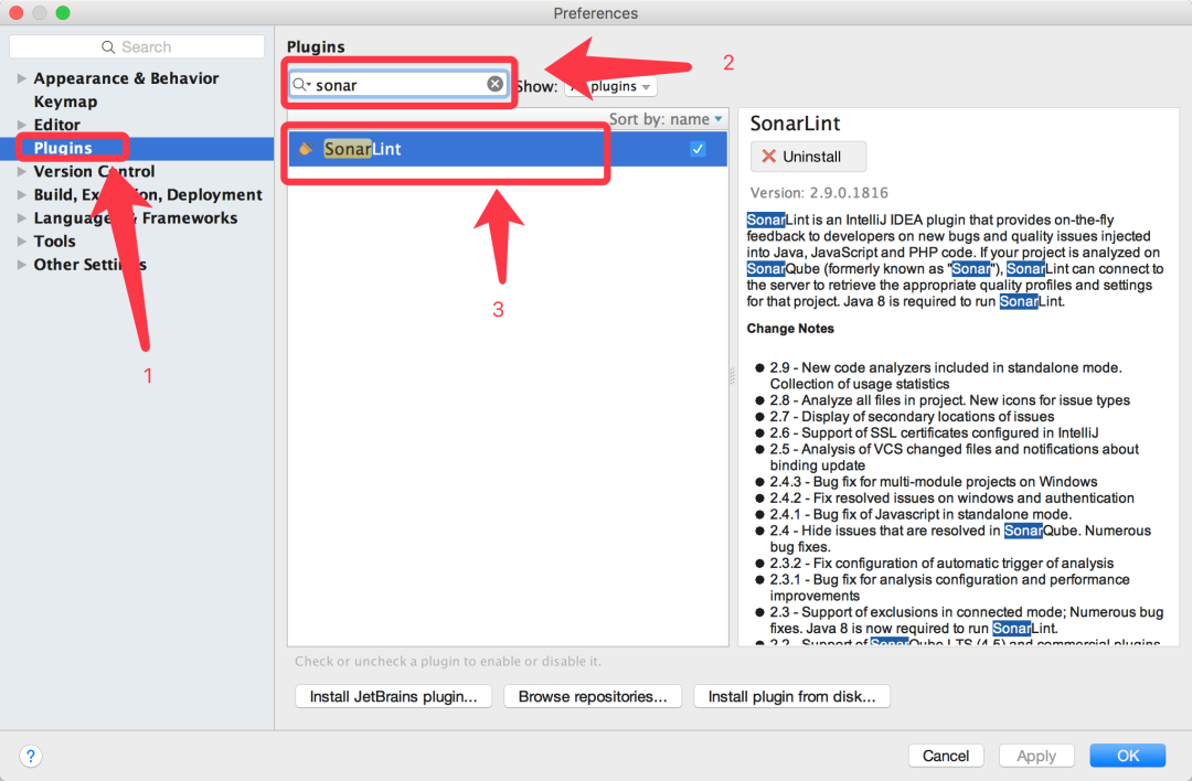 设置——>Plugins中查找sonarLint插件,并安装。安装完成后,要重启IDEA。