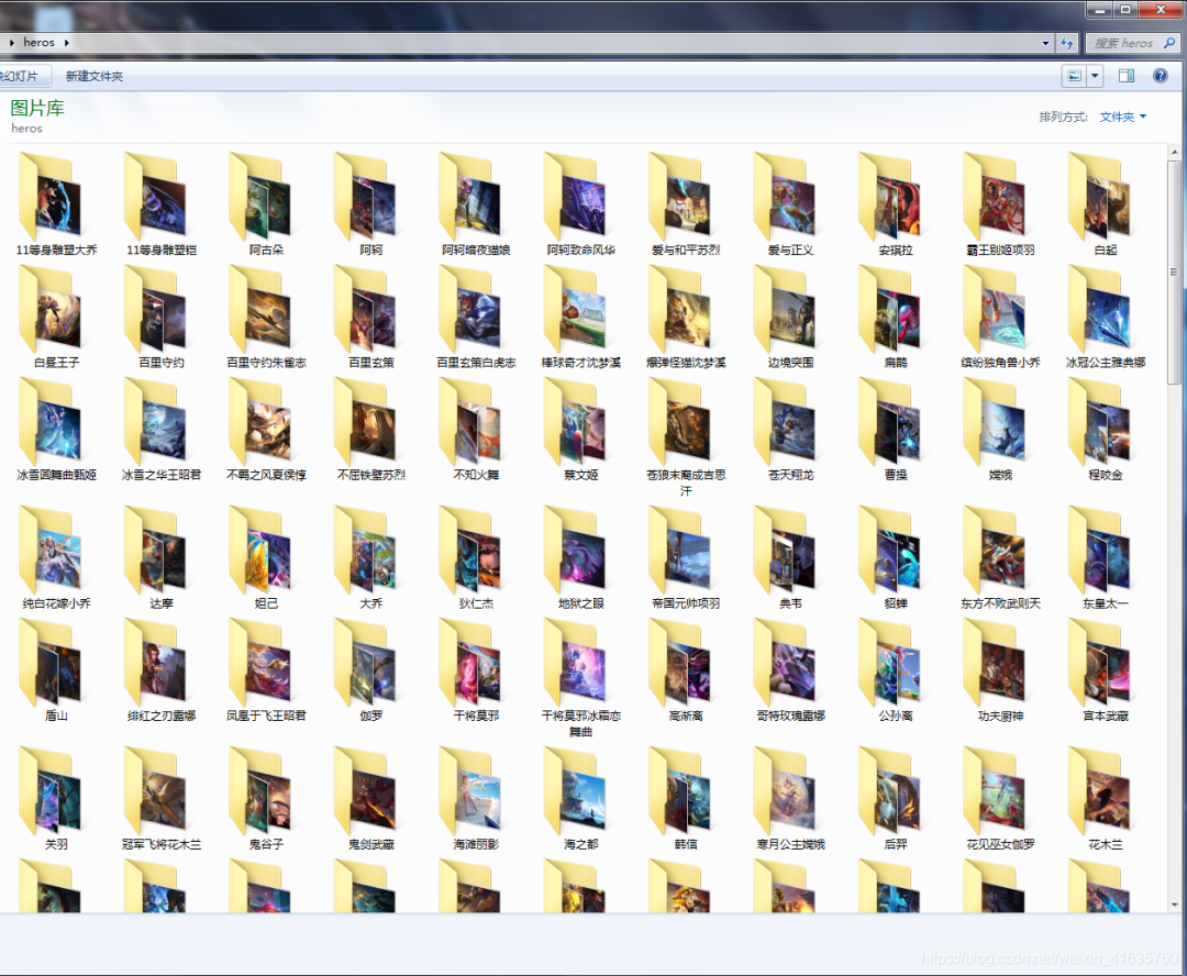 print('---下载开始...')page = 0offset = 0total_response = self.request(self.url.format(page)).texttotal_res = json.loads(total_response)total_page = --int(total_res['iTotalPages'])print('---总共 {} 页...' . format(total_page))while True:if offset > total_page:breakurl = self.url.format(offset)response = self.request(url).textresult = json.loads(response)now = 0for item in result["List"]:now += 1hero_name = parse.unquote(item['sProdName']).split('-')[0]hero_name = re.sub(r'[【】:.<>|·@#$%^&() ]', '', hero_name)print('---正在下载第 {} 页 {} 英雄 进度{}/{}...' . format(offset, hero_name, now, len(result["List"])))hero_url = parse.unquote(item['sProdImgNo_{}'.format(str(size))])save_path = self.save_path + '/' + hero_namesave_name = save_path + '/' + hero_url.split('/')[-2]if not os.path.exists(save_path):os.makedirs(save_path)if not os.path.exists(save_name):with open(save_name, 'wb') as f:response_content = self.request(hero_url.replace("/200", "/0")).contentf.write(response_content)offset += 1print('---下载完成...')