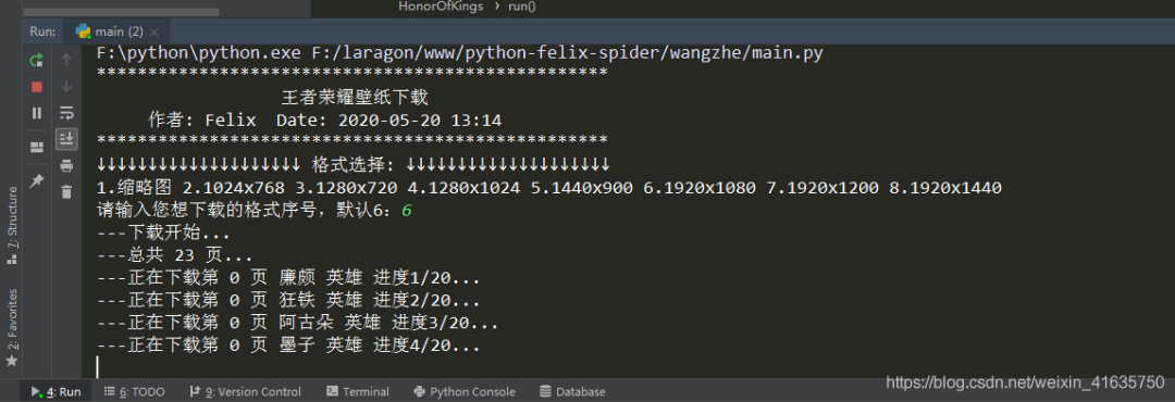 #!/usr/bin/env python# encoding: utf-8'''#-------------------------------------------------------------------# CONFIDENTIAL --- CUSTOM STUDIOS#-------------------------------------------------------------------## @Project Name : 王者荣耀壁纸下载## @File Name : main.py## @Programmer : Felix## @Start Date : 2020/7/30 14:42## @Last Update : 2020/7/30 14:42##-------------------------------------------------------------------'''import os, time, requests, json, refrom retrying import retryfrom urllib import parseclass HonorOfKings:'''This is a main Class, the file contains all documents.One document contains paragraphs that have several sentencesIt loads the original file and converts the original file to new contentThen the new content will be saved by this class'''def __init__(self, save_path='./heros'):self.save_path = save_pathself.time = str(time.time()).split('.')self.url = 'https://apps.game.qq.com/cgi-bin/ams/module/ishow/V1.0/query/workList_inc.cgi?activityId=2735&sVerifyCode=ABCD&sDataType=JSON&iListNum=20&totalpage=0&page={}&iOrder=0&iSortNumClose=1&iAMSActivityId=51991&_everyRead=true&iTypeId=2&iFlowId=267733&iActId=2735&iModuleId=2735&_=%s' % self.time[0]def hello(self):'''This is a welcome speech:return: self'''print("*" * 50)print(' ' * 18 + '王者荣耀壁纸下载')print(' ' * 5 + '作者: Felix Date: 2020-05-20 13:14')print("*" * 50)return selfdef run(self):'''The program entry'''print('↓' * 20 + ' 格式选择: ' + '↓' * 20)print('1.缩略图 2.1024x768 3.1280x720 4.1280x1024 5.1440x900 6.1920x1080 7.1920x1200 8.1920x1440')size = input('请输入您想下载的格式序号,默认6:')size = size if size and int(size) in [1,2,3,4,5,6,7,8] else 6print('---下载开始...')page = 0offset = 0total_response = self.request(self.url.format(page)).texttotal_res = json.loads(total_response)total_page = --int(total_res['iTotalPages'])print('---总共 {} 页...' . format(total_page))while True:if offset > total_page:breakurl = self.url.format(offset)response = self.request(url).textresult = json.loads(response)now = 0for item in result["List"]:now += 1hero_name = parse.unquote(item['sProdName']).split('-')[0]hero_name = re.sub(r'[【】:.<>|·@#$%^&() ]', '', hero_name)print('---正在下载第 {} 页 {} 英雄 进度{}/{}...' . format(offset, hero_name, now, len(result["List"])))hero_url = parse.unquote(item['sProdImgNo_{}'.format(str(size))])save_path = self.save_path + '/' + hero_namesave_name = save_path + '/' + hero_url.split('/')[-2]if not os.path.exists(save_path):os.makedirs(save_path)if not os.path.exists(save_name):with open(save_name, 'wb') as f:response_content = self.request(hero_url.replace("/200", "/0")).contentf.write(response_content)offset += 1print('---下载完成...')def request(self, url):'''Send a request:param url: the url of request:param timeout: the time of request:return: the result of request'''response = requests.get(url, timeout=10)assert response.status_code == 200return responseif __name__ == "__main__":HonorOfKings().hello().run()