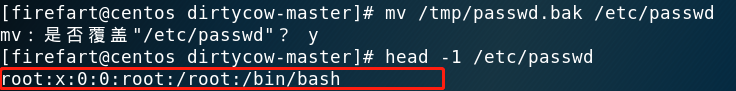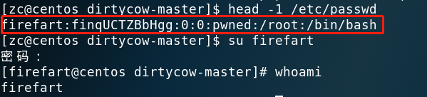 可以看到用户firefart的用户ID,组ID都是0,所以提权成功;