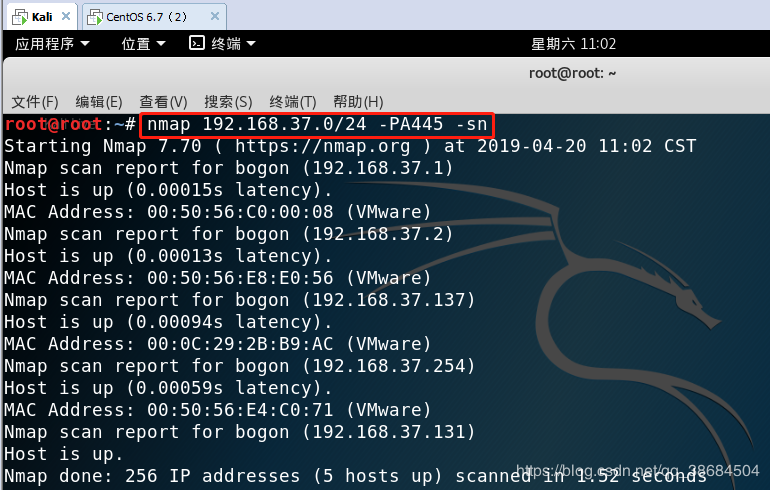 nmap 192.168.37.0/24 -PA445 -sn #使用ACK的方式去扫描多个主机,当收到RST包时,目标主机存活;