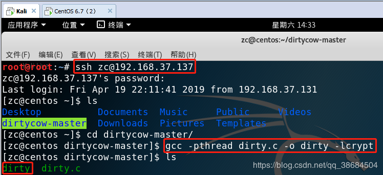 3.3> 使用kali远程连接目标主机,进入普通用户zc查看dirtycow,并进行编译;