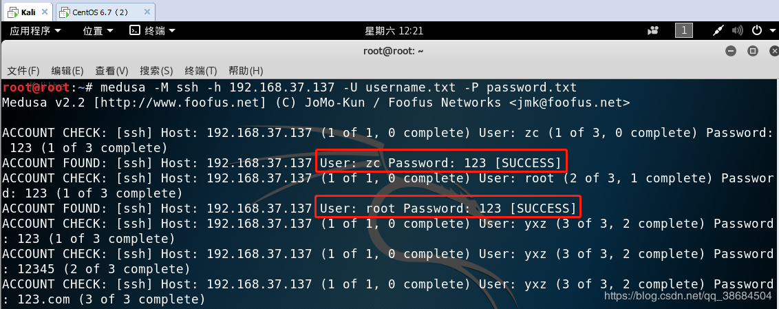 medusa -M ssh -h 192.168.37.137 -U username.txt -P password.txt