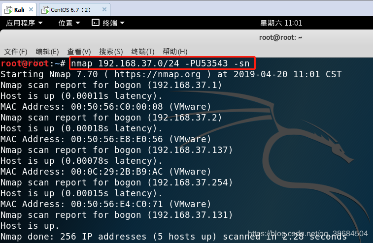 nmap 192.168.37.0/24 -PU53543 -sn #使用UDP的方式去扫描多个主机,当返回端口不可达时,即主机存活;