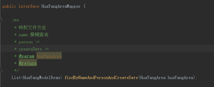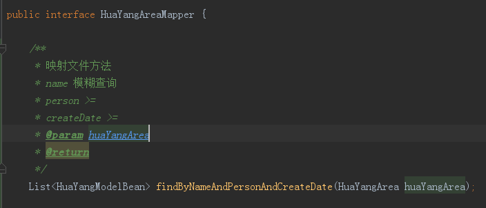List<HuaYangModelBean> list = huaYangService.findByNameAndPersonAndCreateDateWithMyBatisFile(huaYangArea);