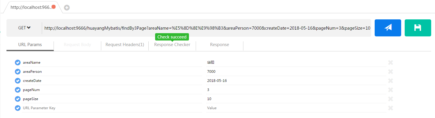 2018-05-18 14:02:31.772 DEBUG 8188 --- [nio-9666-exec-1] s.d.m.H.findByNameAndPersonAndCreateDate : ==> Preparing: select hy.uid uid, hy.create_date createDate, hy.update_date updateDate, hy.area_name areaName, hy.area_person areaPerson from hua_yang_area AS hy WHERE 1=1 AND hy.area_name LIKE '%' ? '%' AND hy.area_person >= ? AND hy.create_date >= ? LIMIT ?, ?