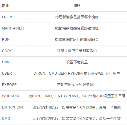 一个Dockerfile遵循特定的格式和指令集。常用指令如下表: