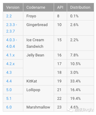 其实,这里说了这么多,精通读心术的我也能想到大家心中的疑问:碎片化如此的 Android 市场,我们就算是适配了 N 的特性,大家也没有这么快用上,还是歇着吧。嗯,关于碎片化,首先,Android 目前版本分布是酱紫的(来自 Google 官方,链接 http://developer.android.com/about/dashboards/index.html)