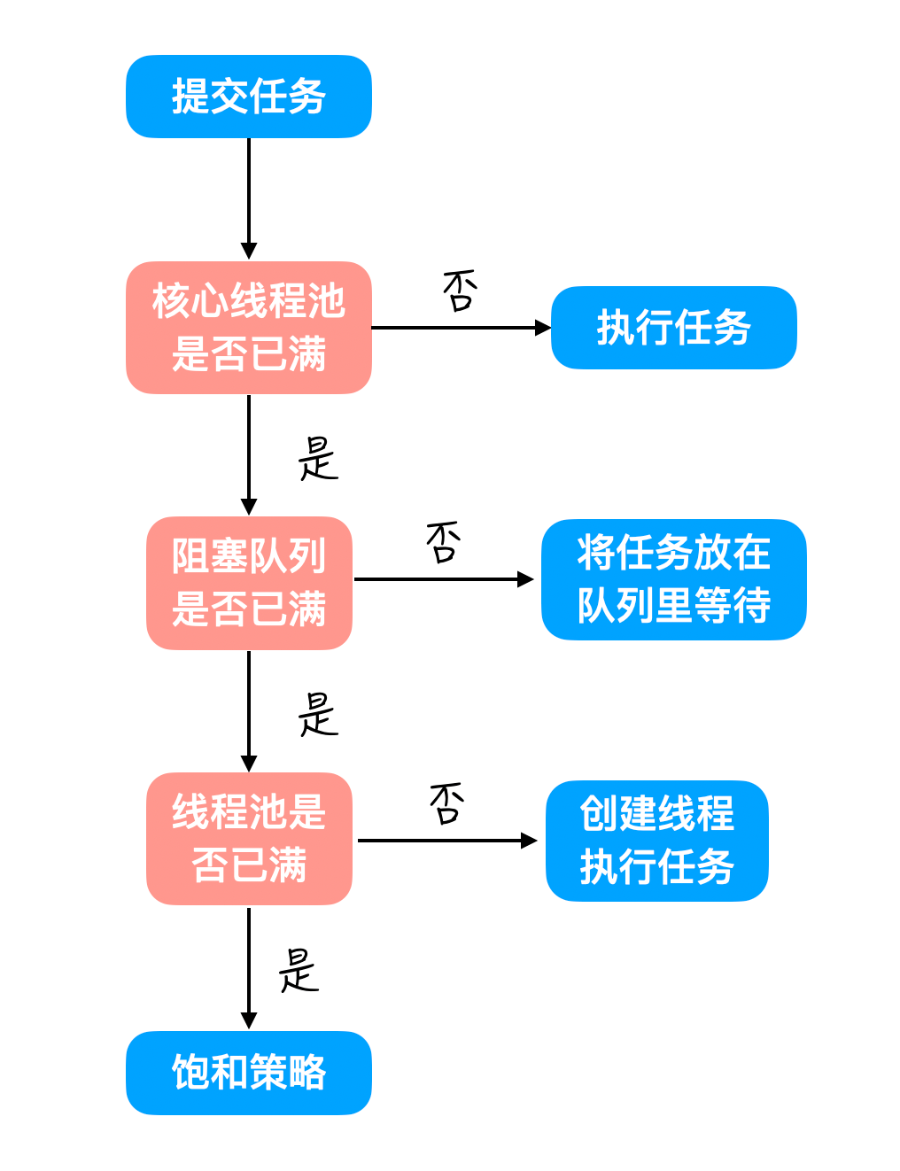 如果已经满了,所以不能继续创建线程了,就需要按照 饱和策略或者叫做 拒绝策略来处理。这个饱和策略我们下文再讲。