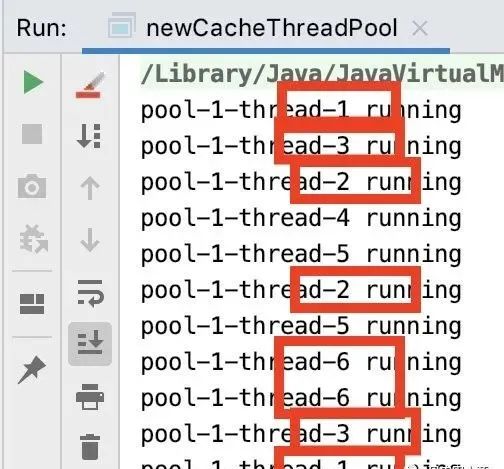 可以很清楚的看到,线程 1、2、3、5、6 都很快重用了。