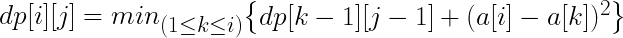 91 dp[i][j] = dp[tmp-1][j-1]+(ll)(a[i]-a[tmp])*(ll)(a[i]-a[tmp]);
