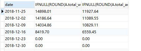 SELECT d.date,IFNULL(ROUND(A.total_weight,2),0), IFNULL(ROUND(A.total_amount,2),0)