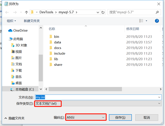 注:需要将my.ini以ANSI的编码保存,具体做法是用记事本打开另存为的方式