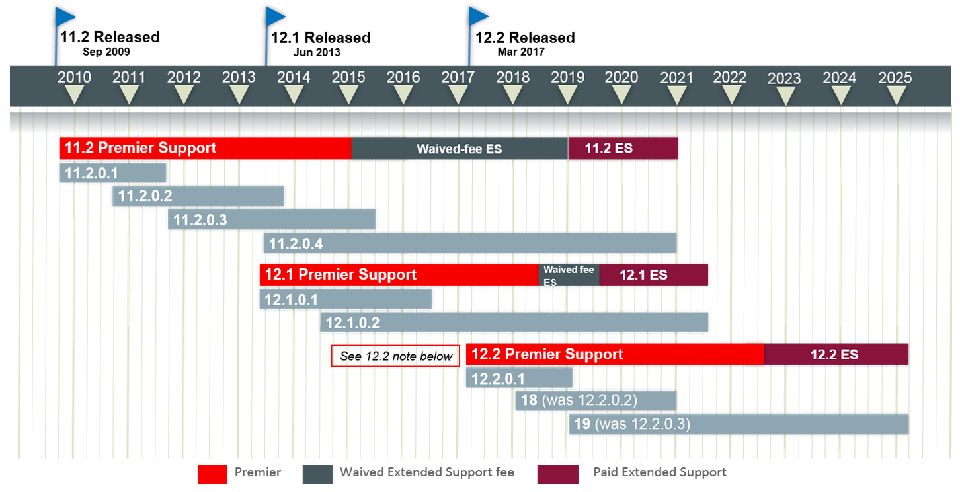 Oracle 19c,或者说是Oracle 12.2.0.3,是12c中稳定的版本,就像Oracle 11.2.0.4,是值得让客户做出升级决策,从Oracle支持的版本序列图中,就可以看出Oracle 19c所处的地位,