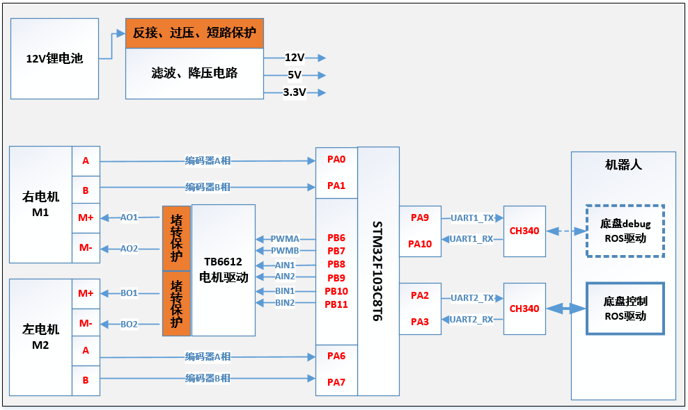好了,有了这个电路板就好办多了。针对这个电路板,讲讲我的设计思路吧。首先需要设计一个电源系统,用于单片机供电、电机供电、外部设备供电,同时还要考虑电源反接、过压、短路等保护;然后需要设计一个stm32单片机最小系统电路;最后围绕stm32最小系统,需要设计电机驱动、UART转USB、编码器信号捕获这些外围电路,同时还要考虑电机堵转保护、电机对系统电源干扰等问题。逐一采坑之后,差不多就完成设计了。stm32主控硬件整体框图,如图10。