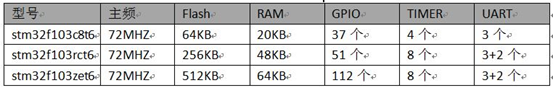 stm32单片机常用的型号是stm32f103,根据具体需求的Flash容量、RAM容量、IO口数量进行选择,下面是常用的一些型号参数对比,如图7。