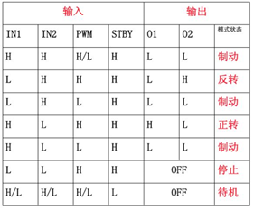 最后,我们来看一下控制信号的逻辑真值表,如图5,输入由单片机IO口给定,再结合PWM信号,便可以实现对电机的正/反转和调速控制了。由于两路电机控制是一模一样的,所以另一路控制信号的逻辑真值表就不重复赘述了。